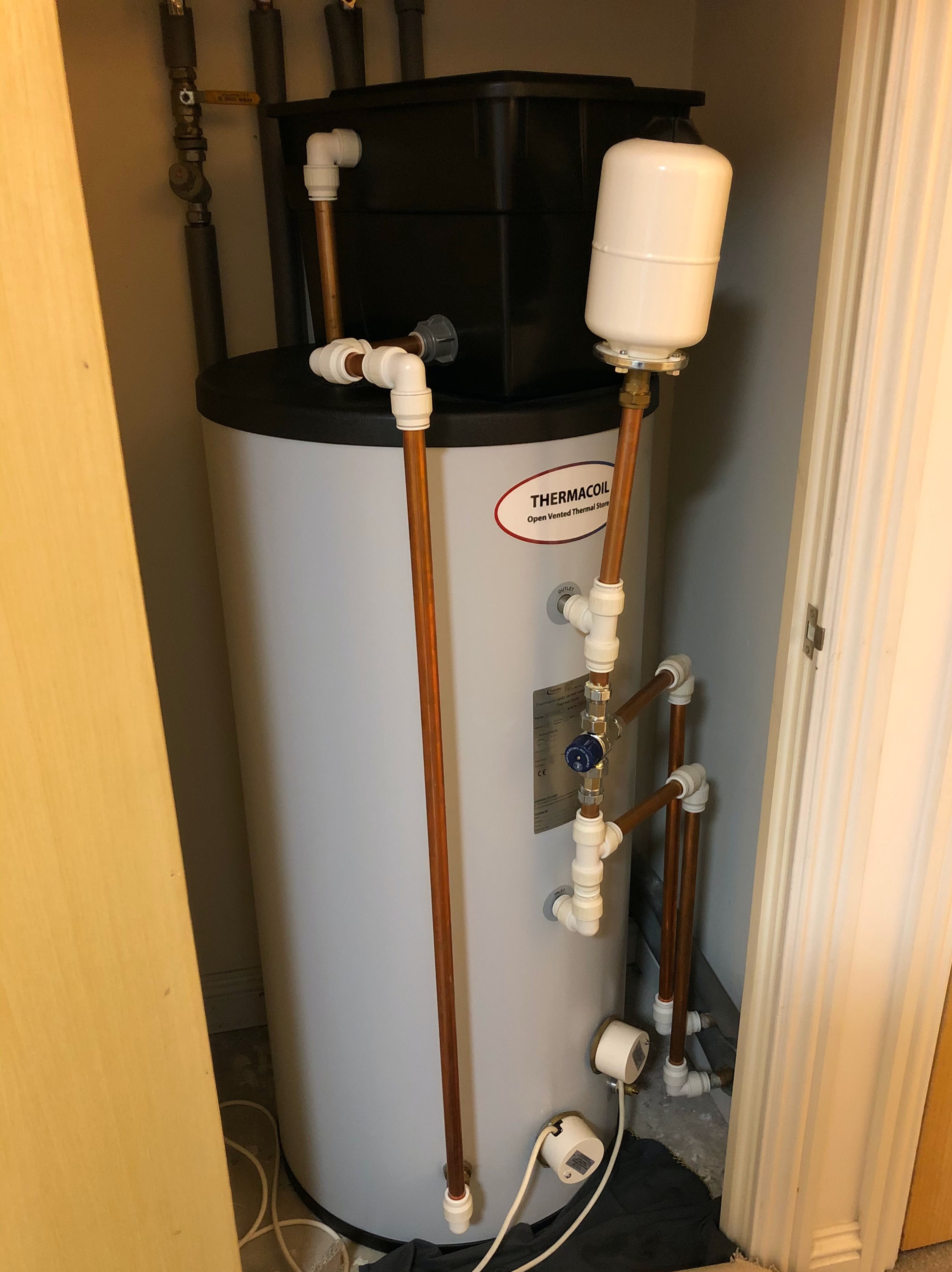 The water temperature from a hot tap is nice and hot initially but rapidly falls to just ‘warm’. This is a classic symptom of water scale in the heat exchanger in a thermal store, and chemical descaling is the fix when the heat exchanger is an internal tube as with the Thermacoil. Often, the blender valve will be damaged by water scale at the same time and need replacing.