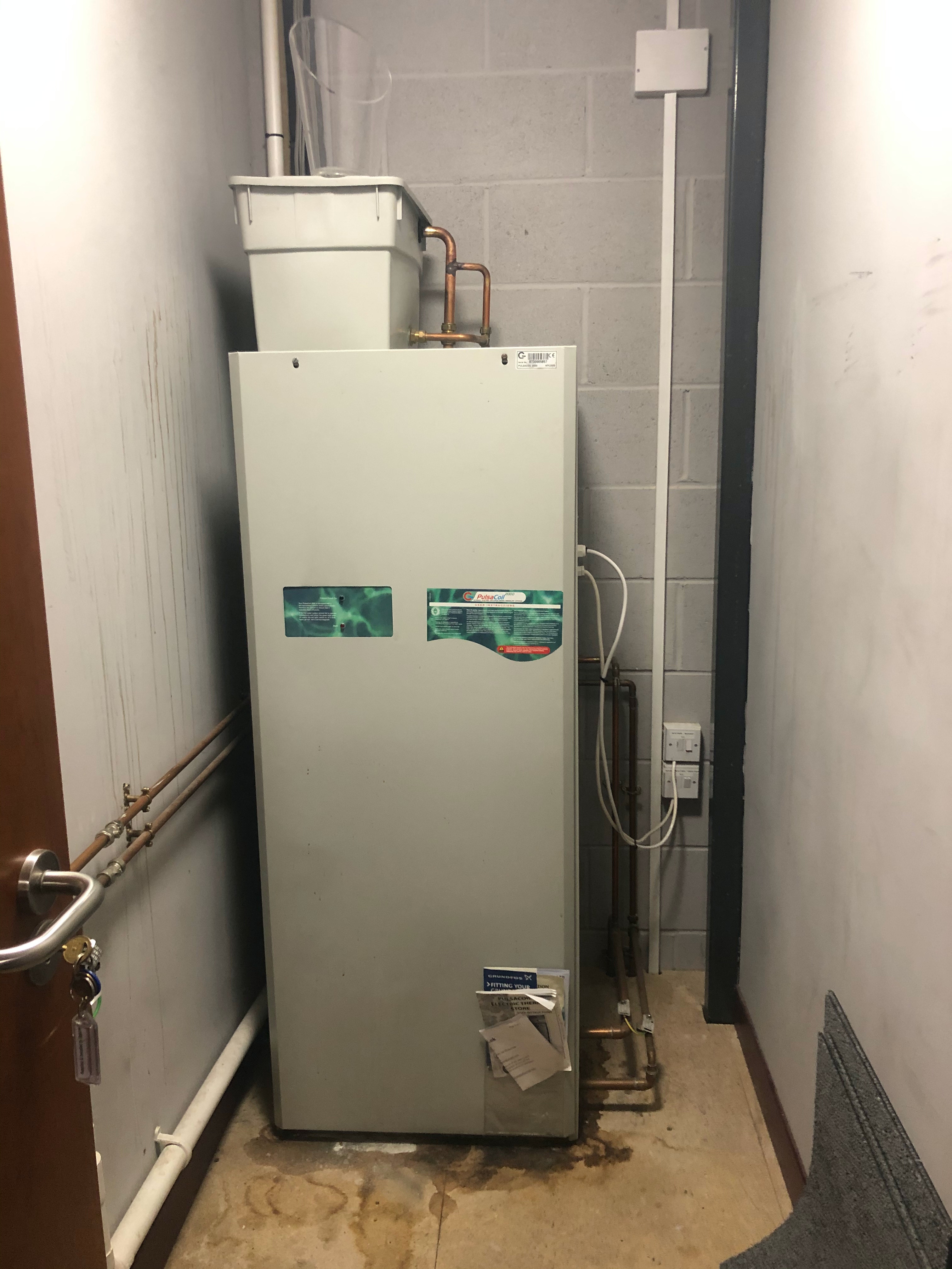 A Pulsacoil 2000 installed near Guildford, just prior to replacement. Note the water marks on the floor where the internal store is leaking.
