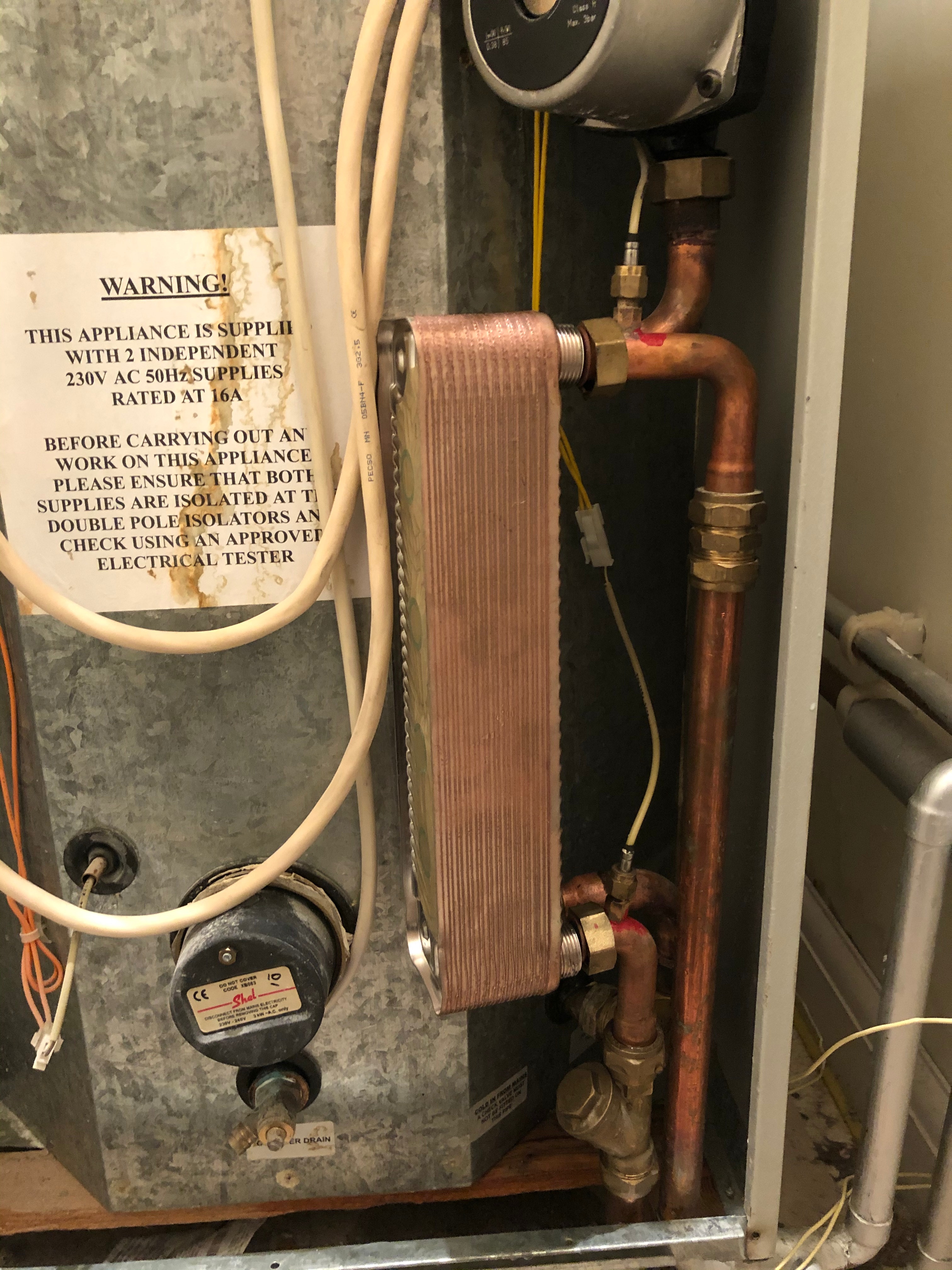 The plate heat exchanger is prone to damage from excessive mains water pressure, so Gledhill specify that a pressure regulator or limiter if there is any risk of the mains water pressure ever rising above 3.0 bar. If damage from high pressure occurs, the result is water leaking internally from the mains water side of the heat exchanger into the thermal store water side. This results in the ‘grey box’ header tank on top of the appliance overflowing, usually very slowly. The unit continues to work but the headrer tank needs manually bailing out every few hours until the heat exchanger is replaced, as they are not fitted with an overflow pipe.