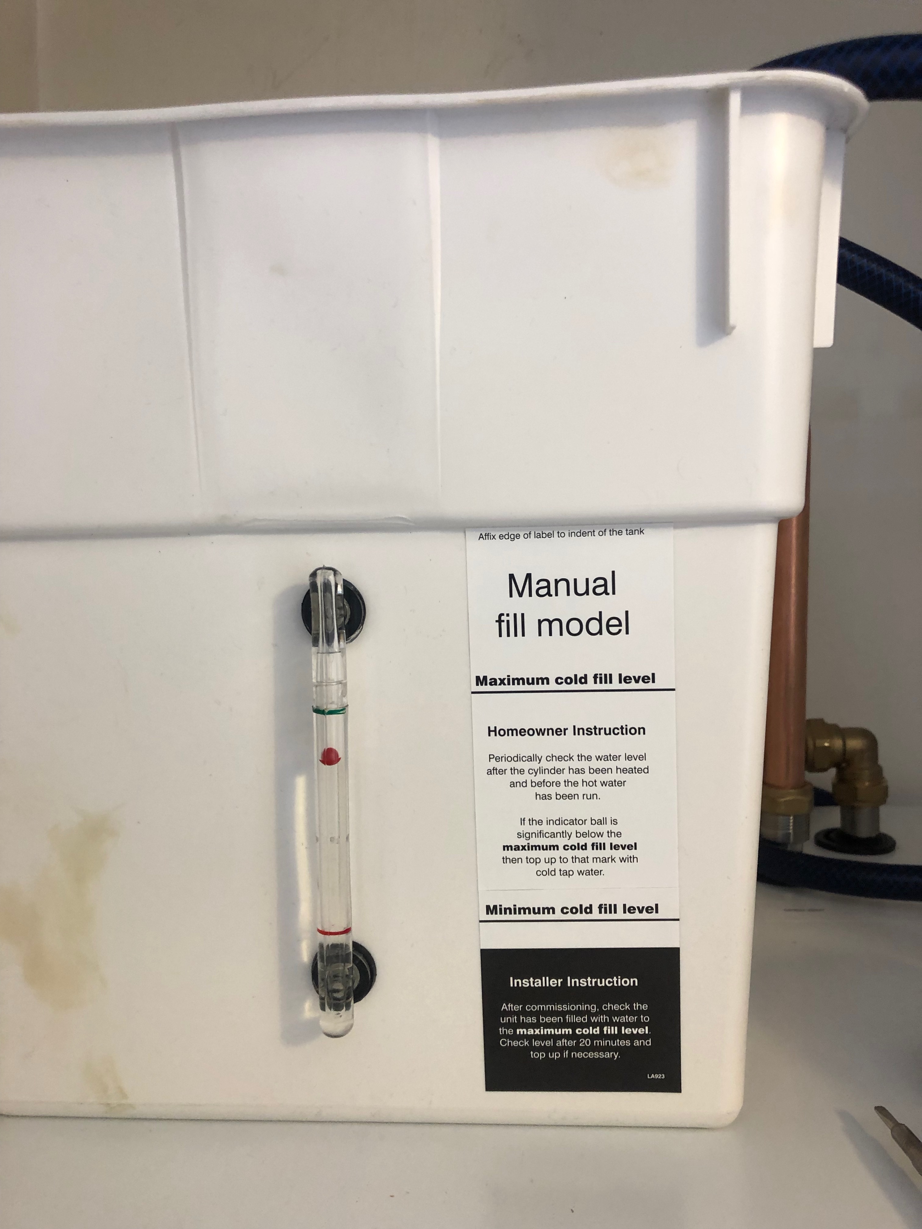 As with all Pulsacoils the header tank needs to be topped up with more water to the correct level periodically. With the Pulsacoil Stainless this could be as infrequently as every few years but eventually, as the water level slowly decreases, the hot water will eventually stop working. To start with the hot water will work intermittently, but the intermittent failures will grow more frequent. There is a sight gauge on the front of the header tank and if checking it shows the red indicator float at the bottom of the gauge, add more water. It could take several buckets of water to get the level up to near the green line, as shown in the photo.