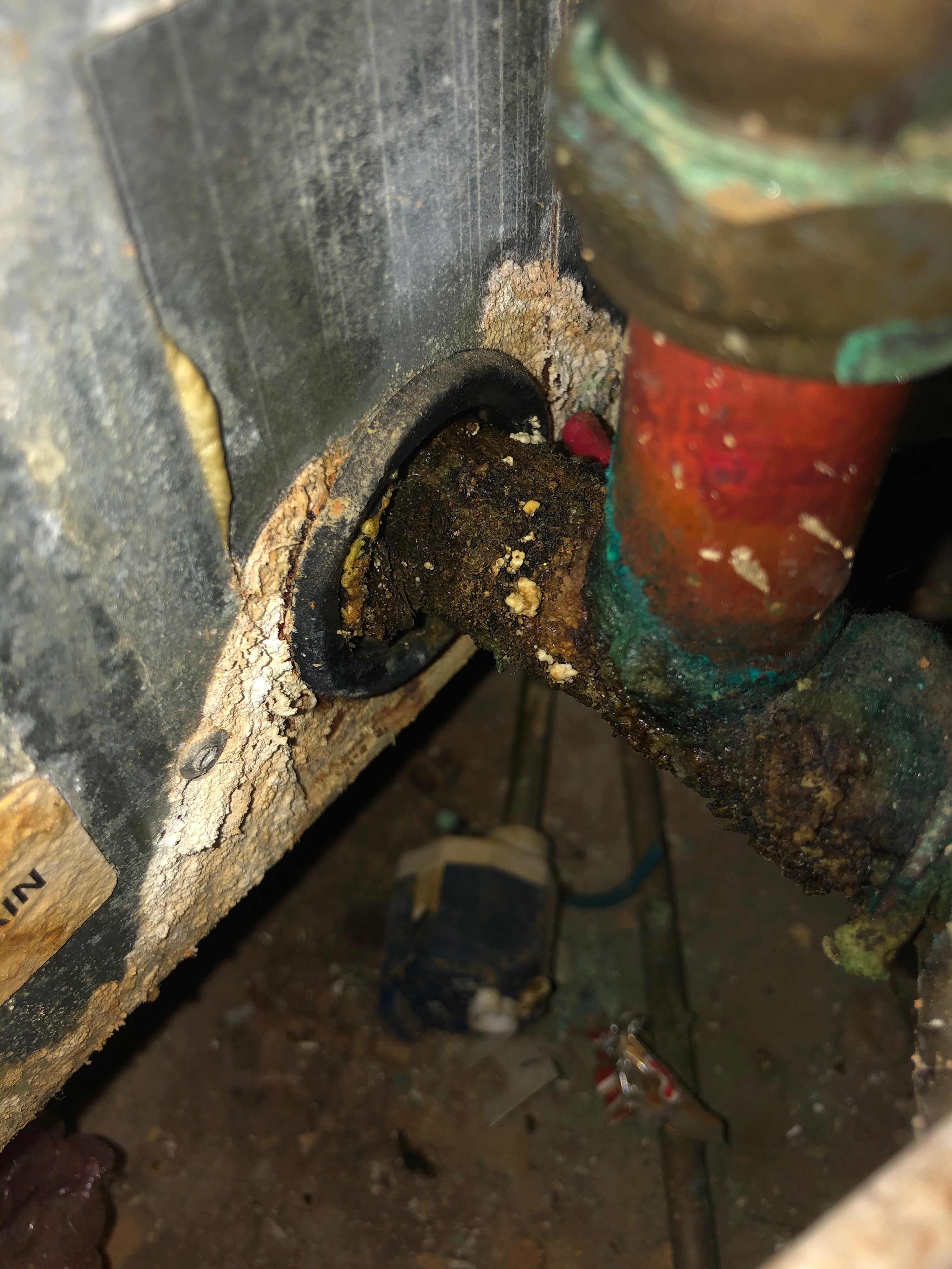 The leak from inside means you’ll need to top up the plastic header tank on top periodically (to replace the leaked water) in order to keep it working, and cope with the dampness in the floor created by the leak. If you can cope with these two things then there is no particular hurry to replace it quickly, or to replace it at all! I get a small trickle of enquiries from people who have been frightened by scaremongering plumbers into believing their Pulsacoil which is leaking so slowly they didn’t even notice, needs replacing urgently. There is no risk of a tiny leak suddenly turning into a flood. The leak may get progressively worse but this takes months or years so don’t allow yourself to be pressured into a hasty decision.