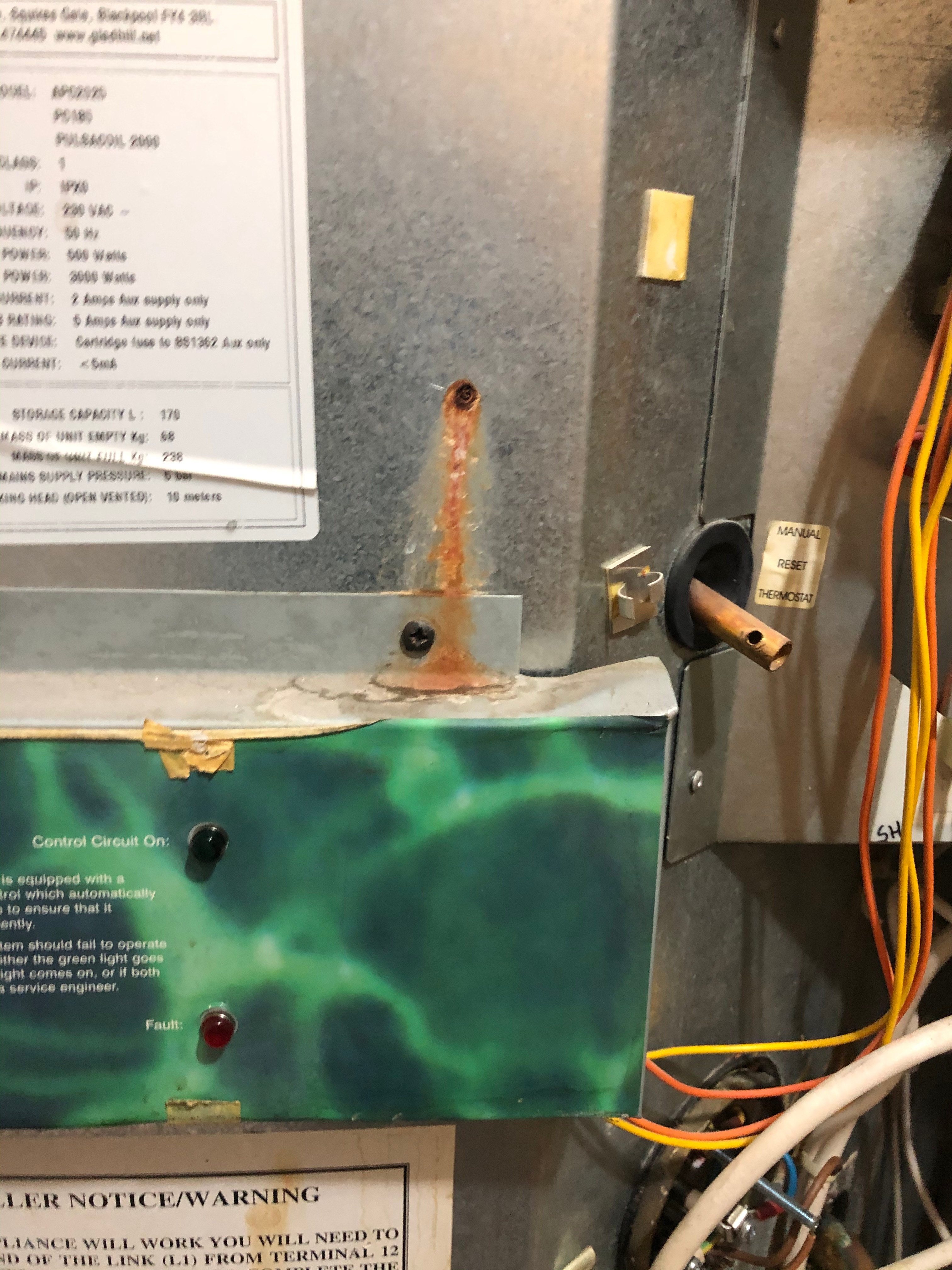 Here are a few photos of a typical Pulsacoil 2000 with a leaking internal tank. Note in particular the rusty areas at the very base and the rust streaks down from the little holes in the outer steel case. If yours has these marks then yes, it is leaking from inside.